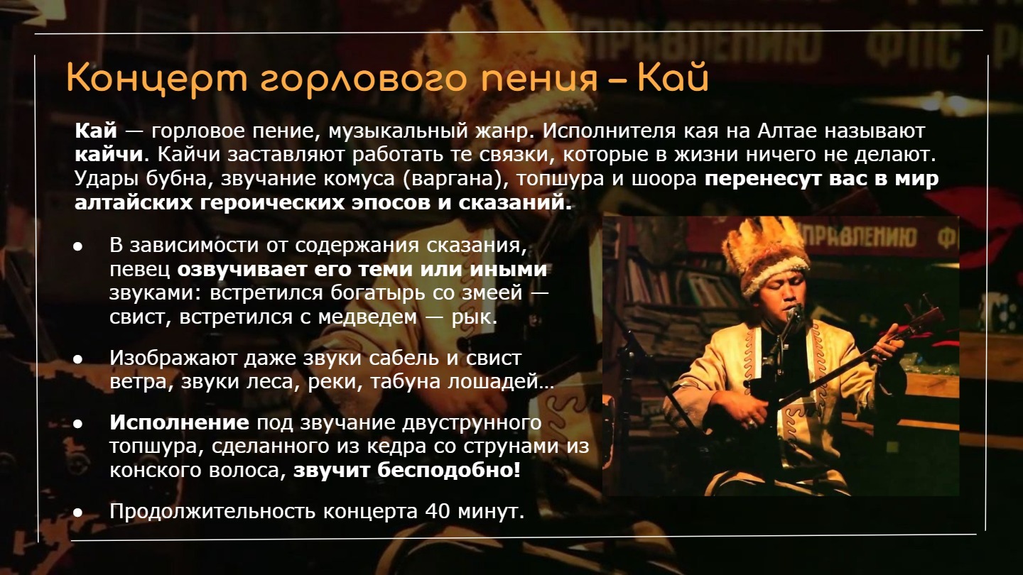 Концерт горлового пения Кай в Этно-Музее (40 минут).