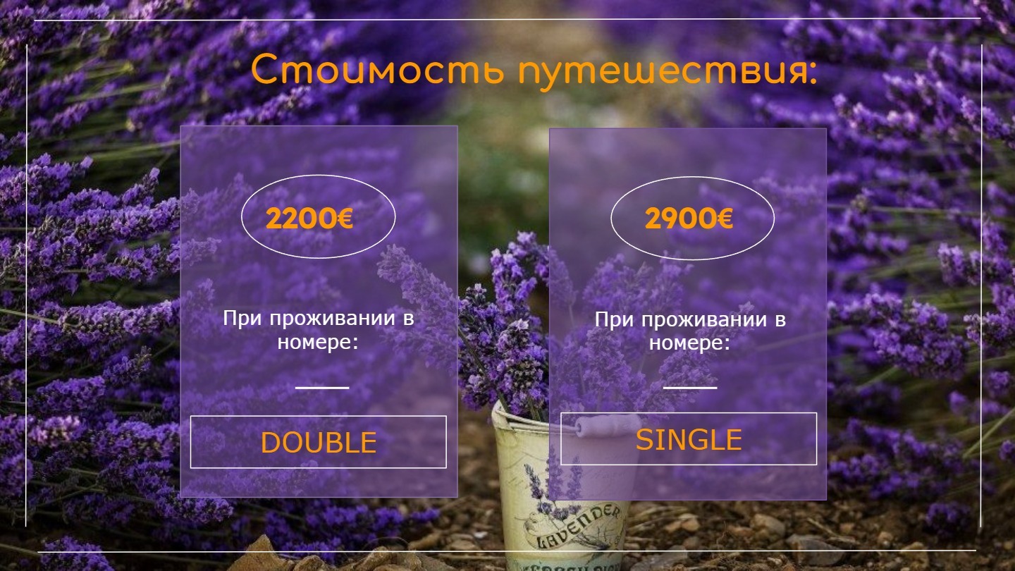 Стоимость: 2200 € с человека при размещении в двухместном номере 2900 € с человека при размещении в одноместном номере